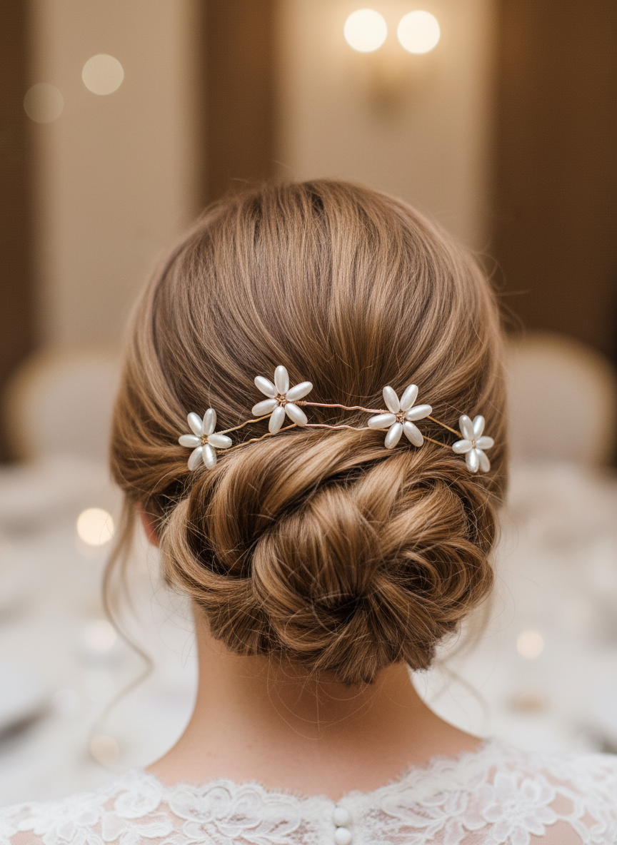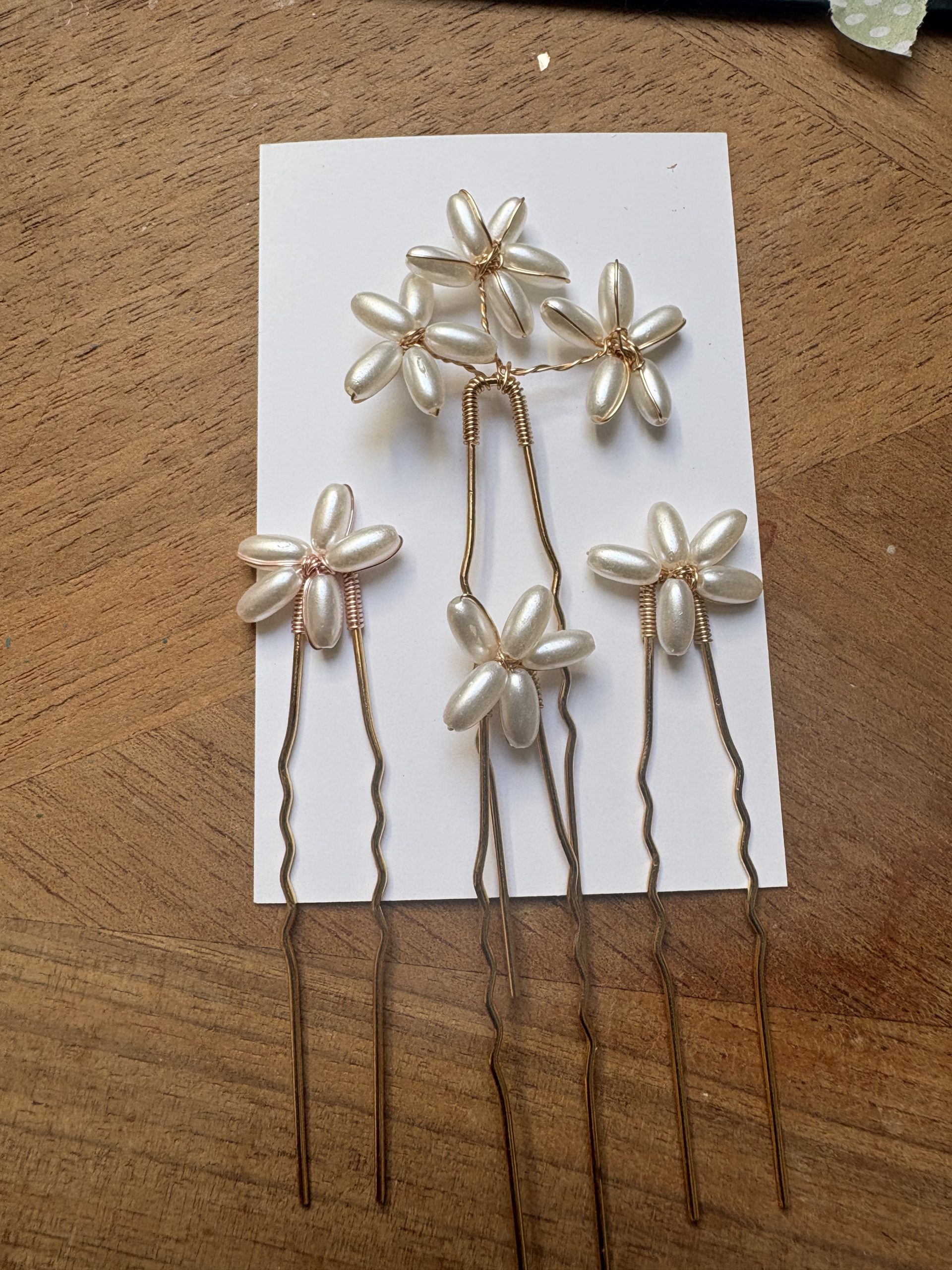 4 épingles en perles 2 formes différentes métal doré ( 15€ les 4) peuvent se mélanger avec le peigne perle