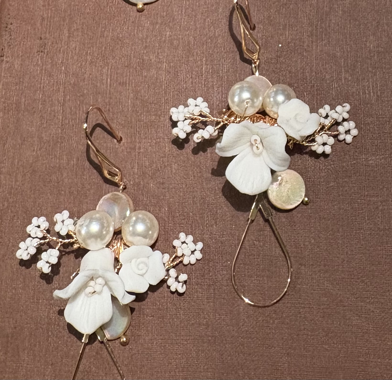 Boucles d’oreilles Melanie longues en métal et doré fleurs en porcelaine