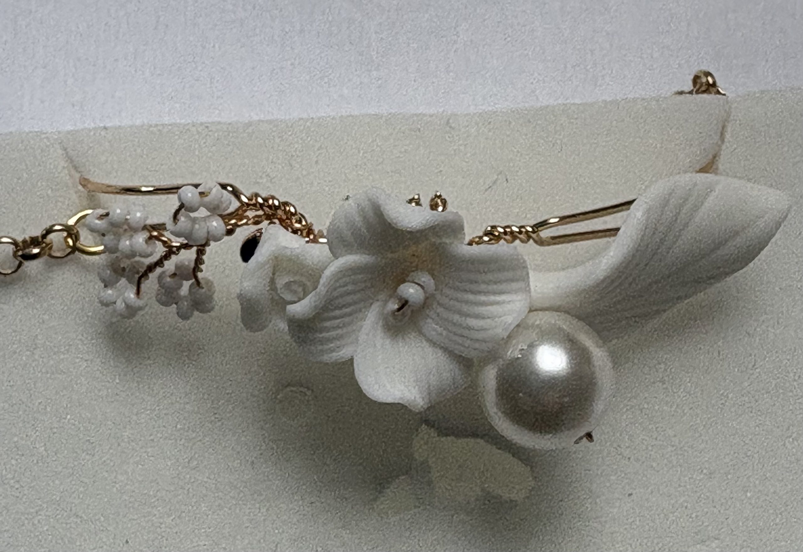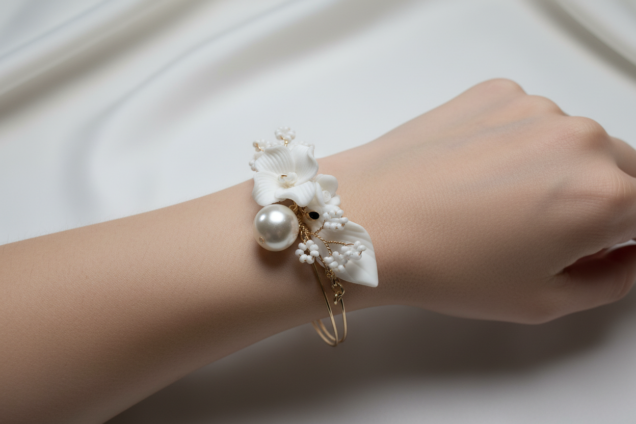 Bracelet réglable avec fleurs et feuilles en porcelaine pour mariée avec motif fleur et feuille – semi rigide ,délicatesse et élégance.