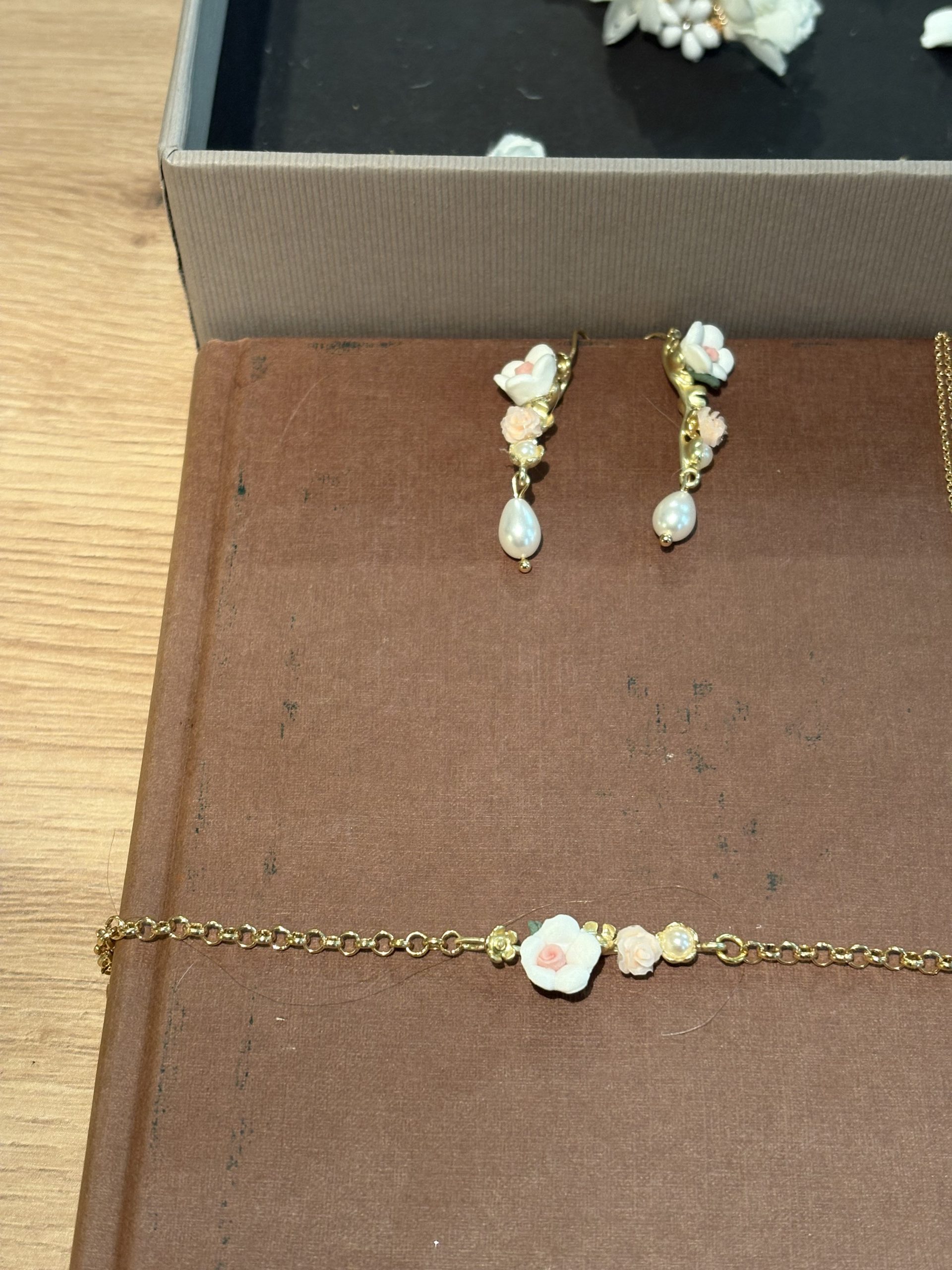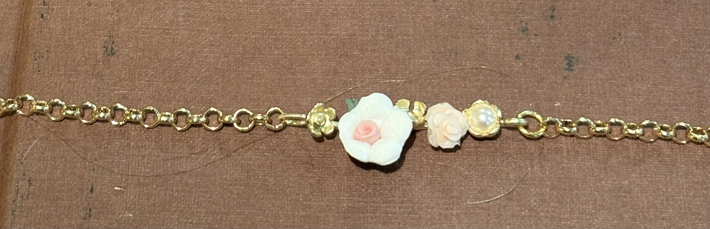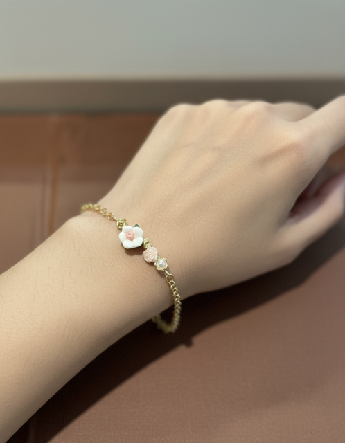 Sublimez votre jour spécial avec ce magnifique bracelet en métal doré avec une rose en porcelaine conçu pour ajouter une touche d’élégance intemporelle à votre tenue de mariage.