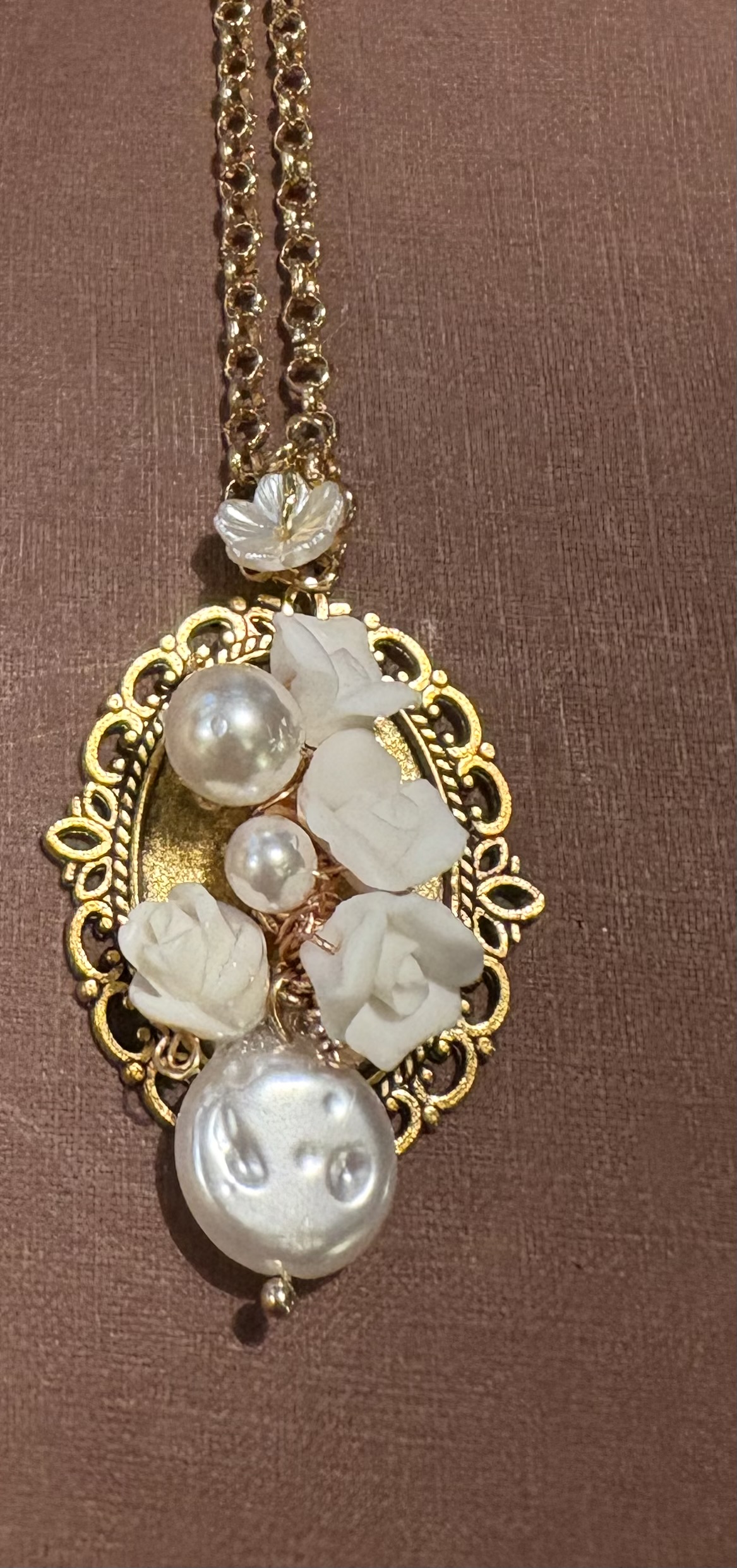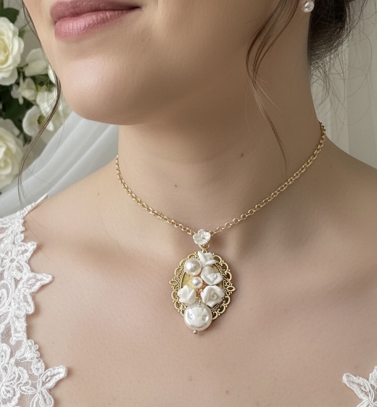 Collier ras de cou (40cms) avec une chaine de réglage perle d’eau et fleurs porcelaine trés romantique boucles d’oreilles et bracelet assortis modéle Mélanie