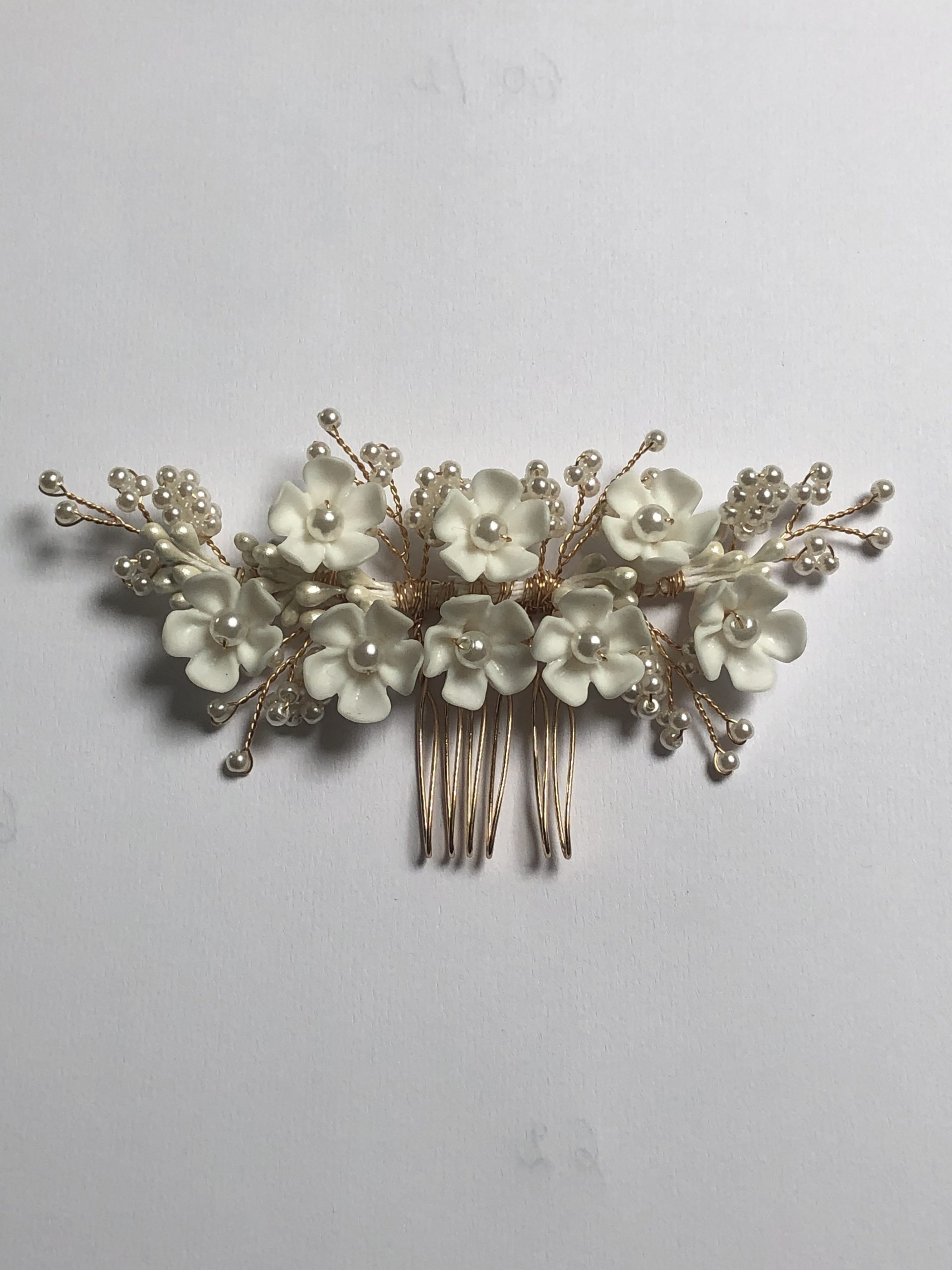 Voici un exemple de texte que vous pourriez utiliser pour décrire un peigne pour mariée orné de perles et de porcelaine :