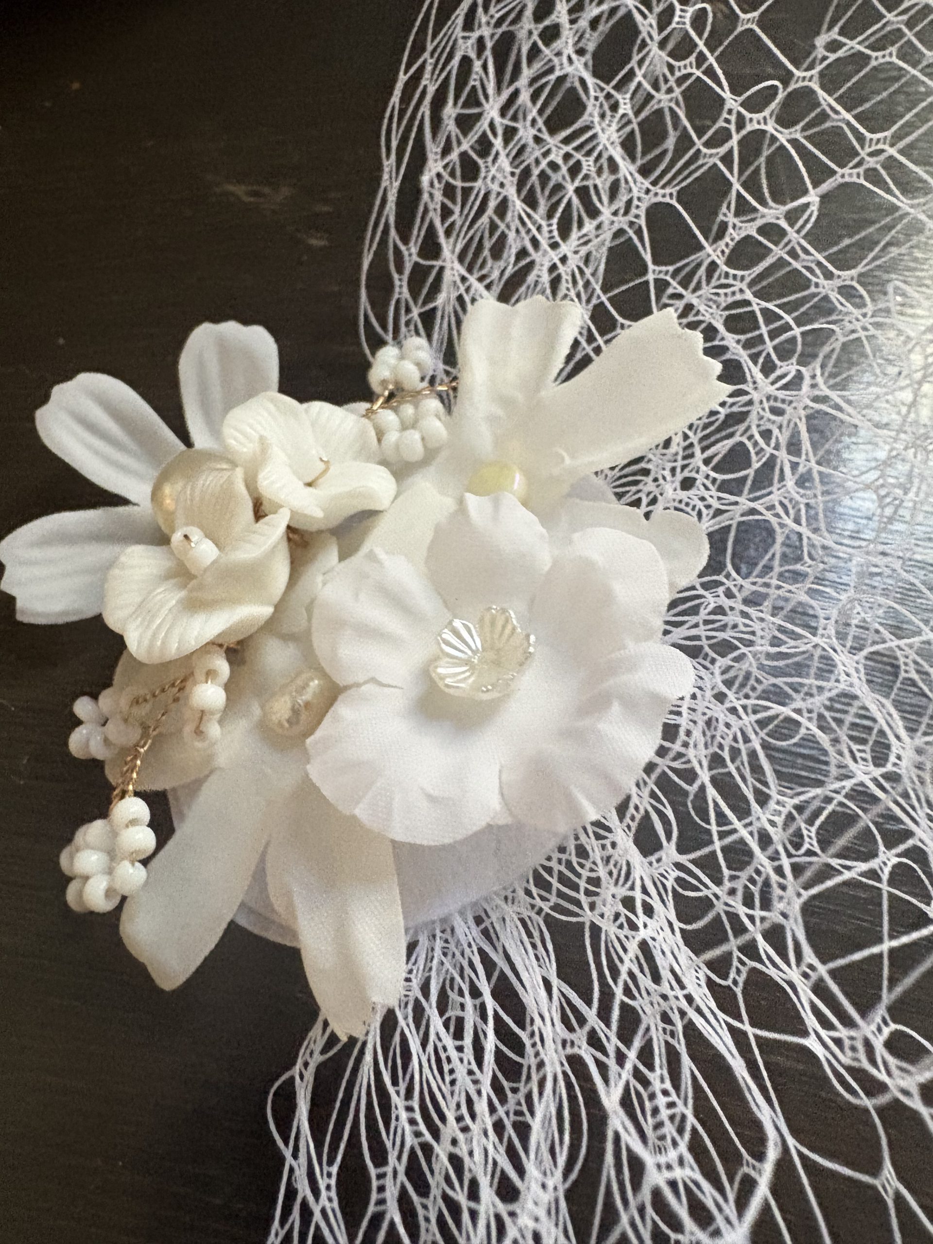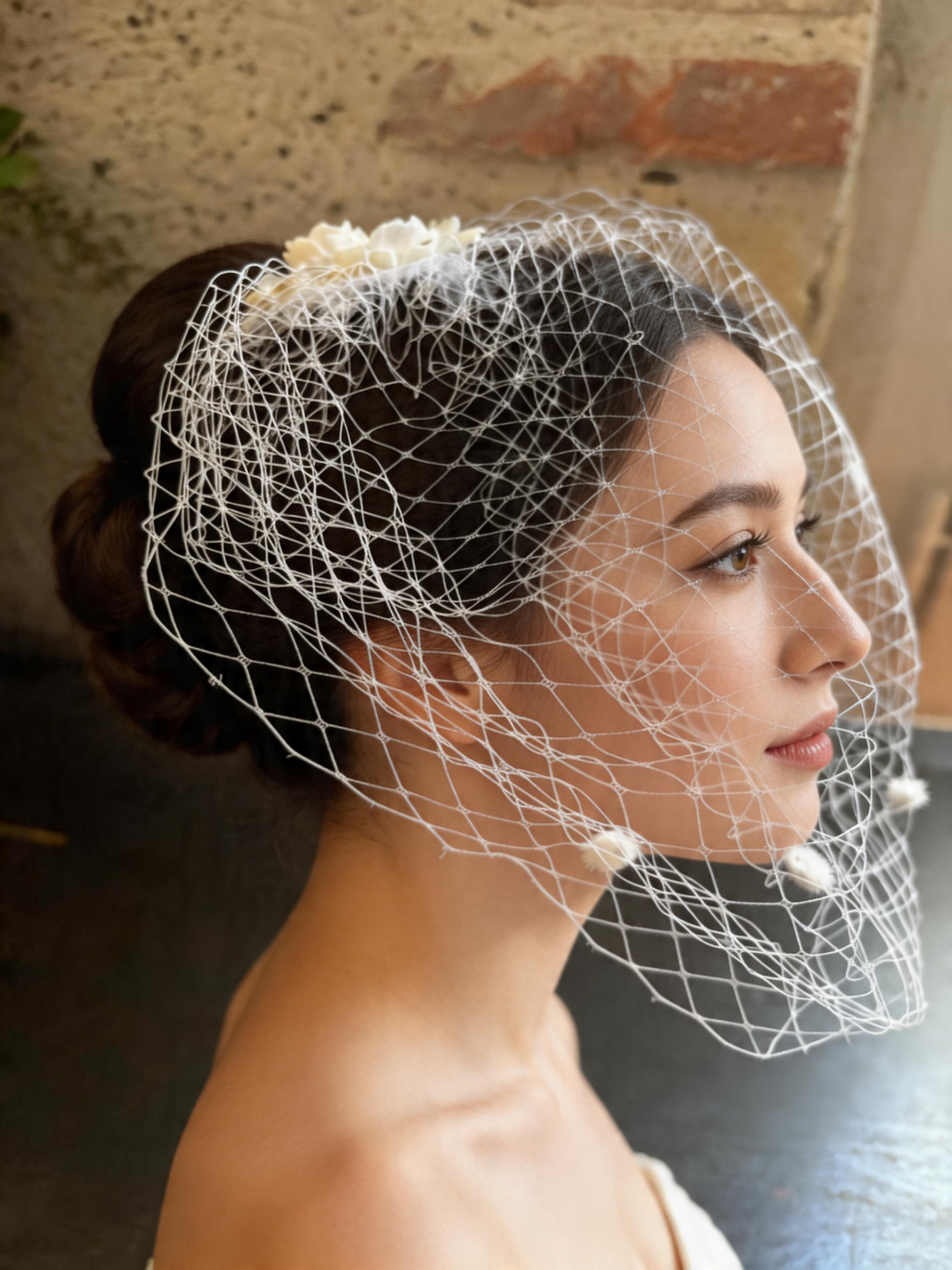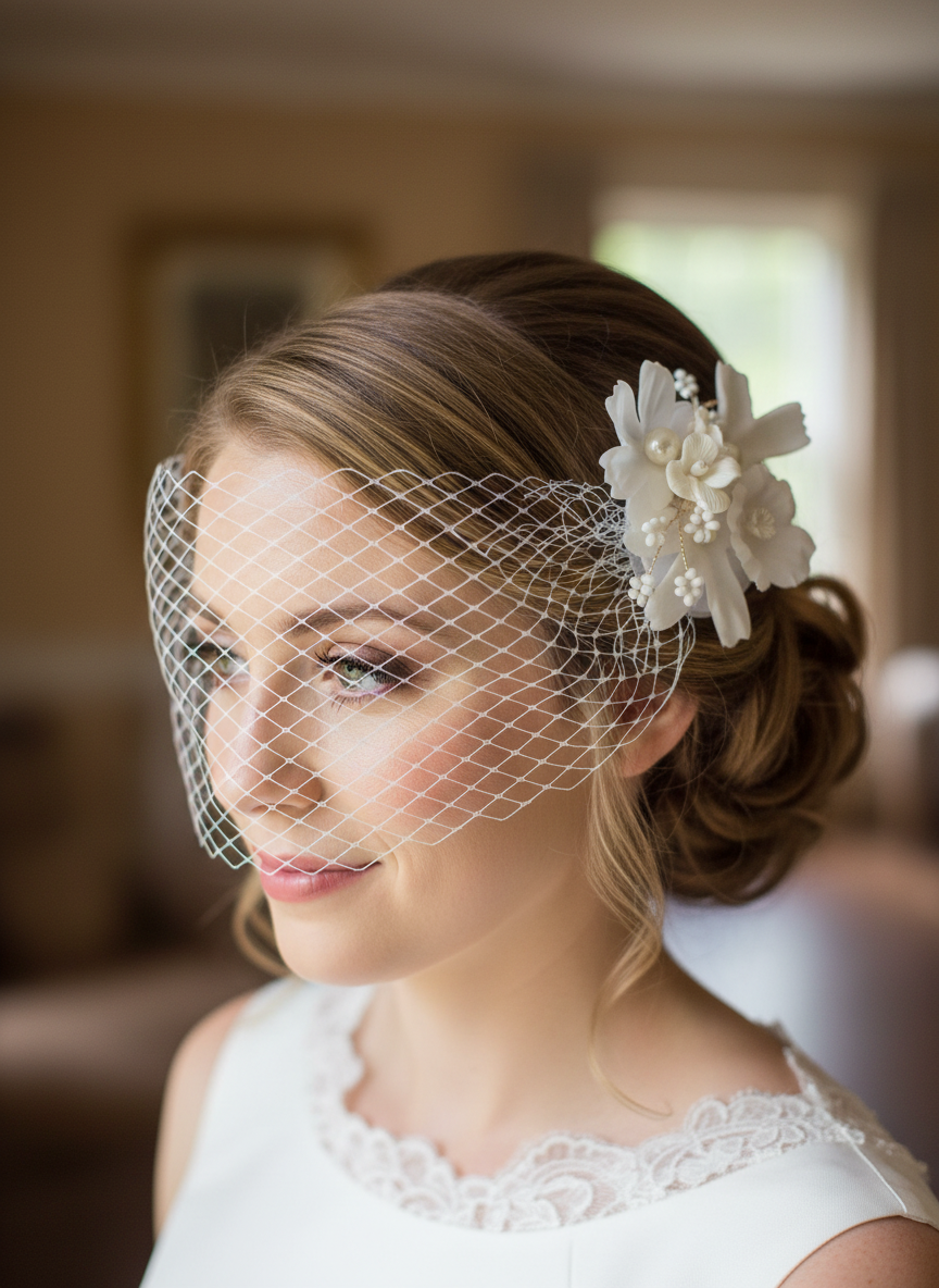 Élégance intemporelle pour le grand jour: voilette légère ornée d’une pince décorative recouverte de délicates fleurs en porcelaine, parfaite pour une allure chic et romantique.